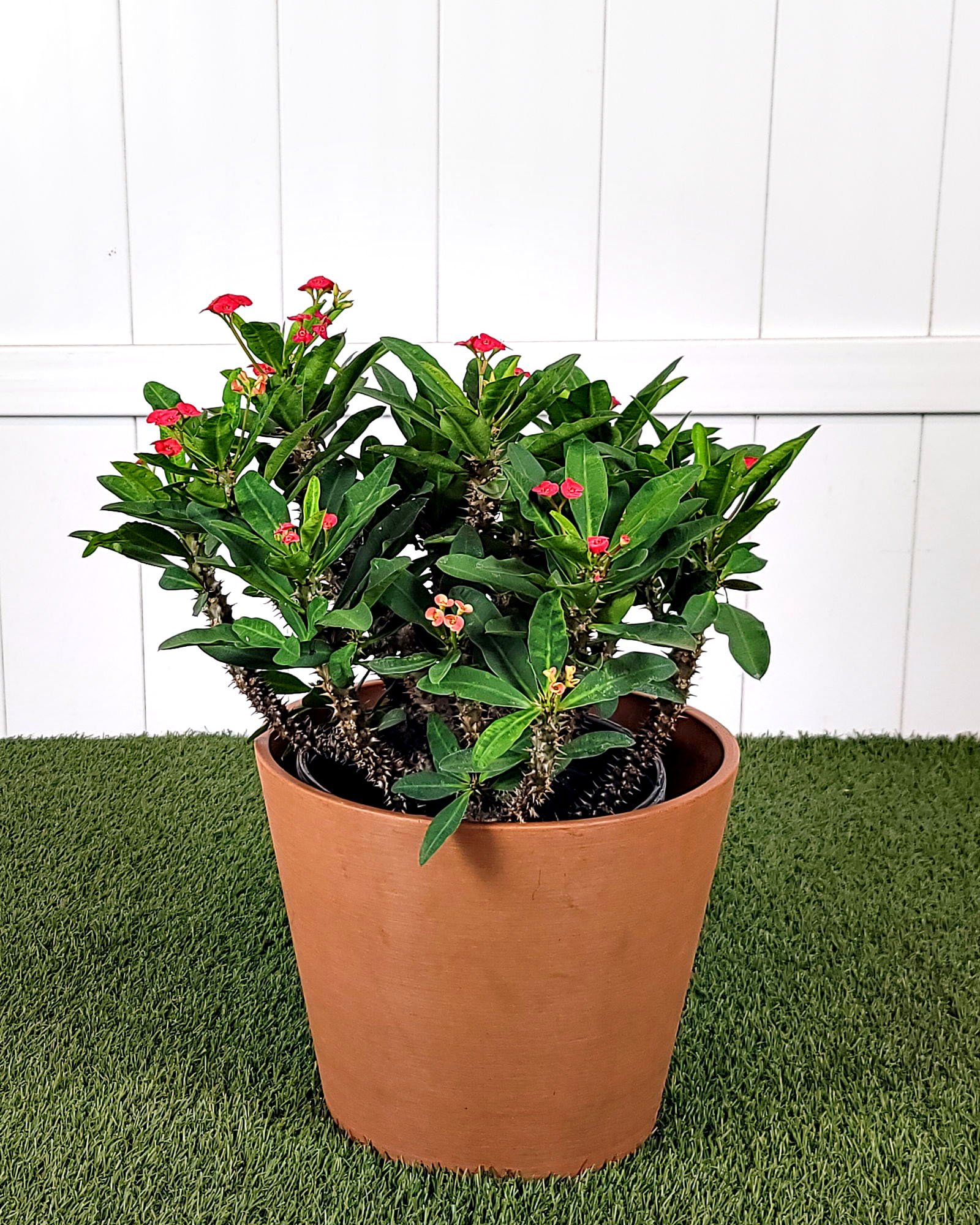 The Euphorbia milii will grow at its best when in full sun, but it will appreciate some afternoon shade in theSummer in hotter climates. Pot in dry to medium moist sand, chalk or loam soil, and whilst this plant is tolerant of dry soil, regular moisture will encourage the best blooms and less leaf drop. However, in the cold winter months it is essential that the soil is kept dry, as wet soil in this season can provefatal. With minimal moisture and fertilizer requirements, Euphobia milii isa low-maintenance plant that is remarkably resistance to most pest and diseases, making it an ideal choice for novice gardeners.