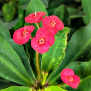 Euphorbia milii is an evergreen shrub, native to Madagascar which has succulent thorny branches, with sparse leathery leaves. The blooms are real showstoppers consisting of small yellow flowers, surrounded by showy, bright red/pink bracts. The Euphorbia milii has a long flowering season, and the blooms can be enjoyed through out the Winter to following Fall when grown indoors. This shrub is a particularly slow growing one, taking between 10 and 20 years to reach its full height.Religious legend states that the ‘Crown of Thorns’ worn by Jesus on the cross,w as made from Euphorbia milii hence its common names.